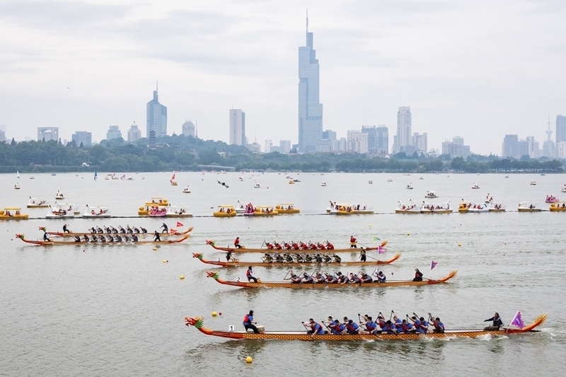 5月31日,龍舟隊(duì)在南京玄武湖上競逐(無人機(jī)照片)。