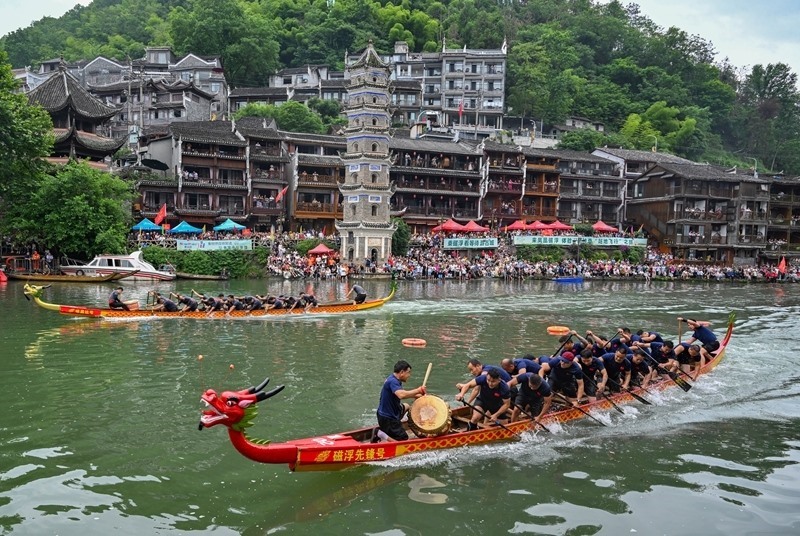 5月31日,在湖南省湘西土家族苗族自治州鳳凰古城,龍舟隊(duì)展開激烈角逐。