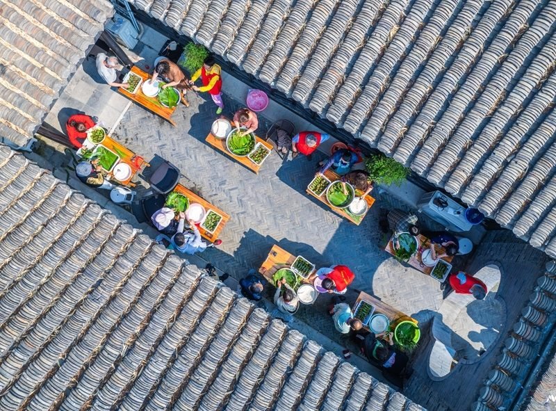 5月29日,在江蘇省興化市新時(shí)代文明實(shí)踐中心,居民參加包粽子比賽(無人機(jī)照片)。