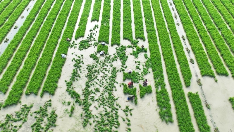 6月8日,在江蘇省宿遷市泗洪縣石集鄉(xiāng)汴水社區(qū),農(nóng)民在秧田中起秧苗(無人機(jī)照片)。