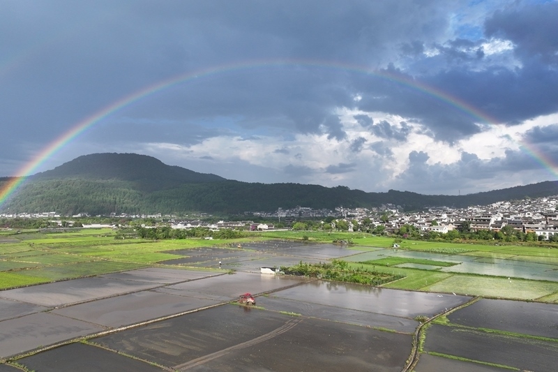 6月8日,在云南省騰沖市和順古鎮(zhèn),農(nóng)民駕駛機(jī)械翻耕農(nóng)田,準(zhǔn)備栽插水稻秧苗(無人機(jī)照片)。