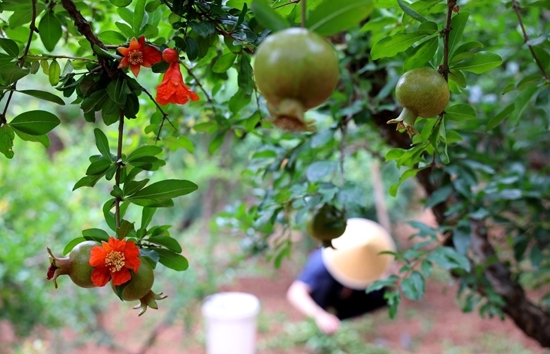 6月18日,在山東棗莊嶧城石榴園,果農(nóng)在石榴樹下勞作。