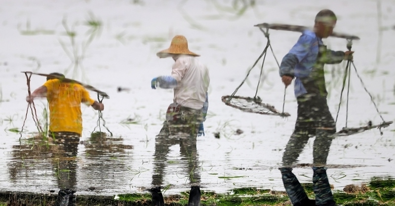6月14日,在江蘇里下河地區(qū)農(nóng)科所(揚(yáng)州市農(nóng)科院),農(nóng)民在水稻田里起秧、運(yùn)秧(照片翻轉(zhuǎn)180度)。