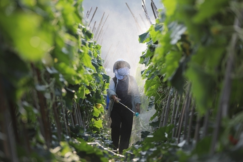 6月12日,貴州省施秉縣城關(guān)鎮(zhèn)白塘村村民在田間管護(hù)冬瓜。