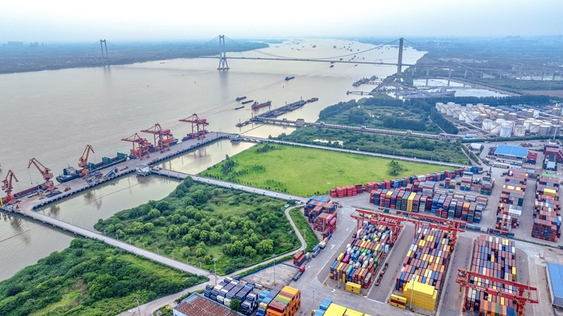 6月29日,在江蘇泰州港集裝箱碼頭,貨船停在泊位裝卸集裝箱(無人機(jī)照片)。