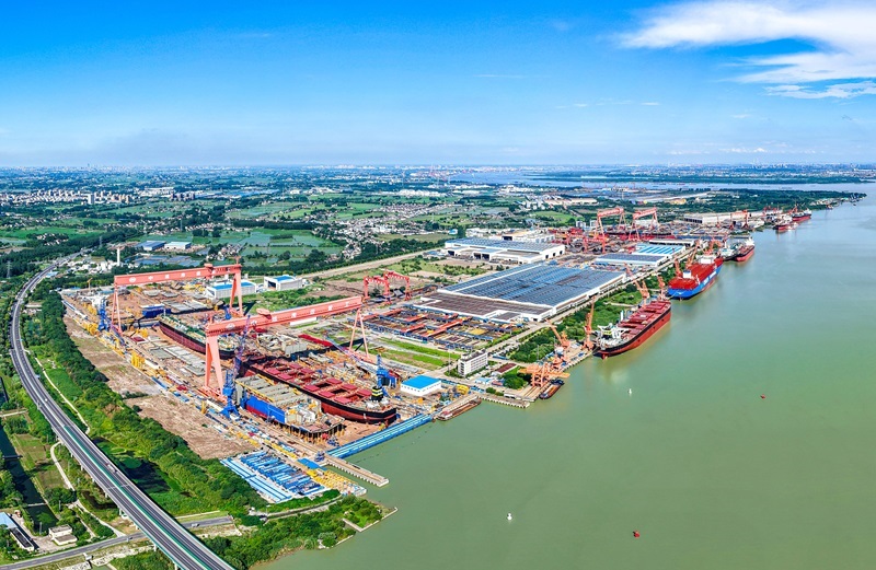 6月28日拍攝的位于江蘇省江都經(jīng)濟(jì)開發(fā)區(qū)的揚(yáng)州中遠(yuǎn)海運(yùn)重工有限公司生產(chǎn)廠區(qū)(無人機(jī)照片)。