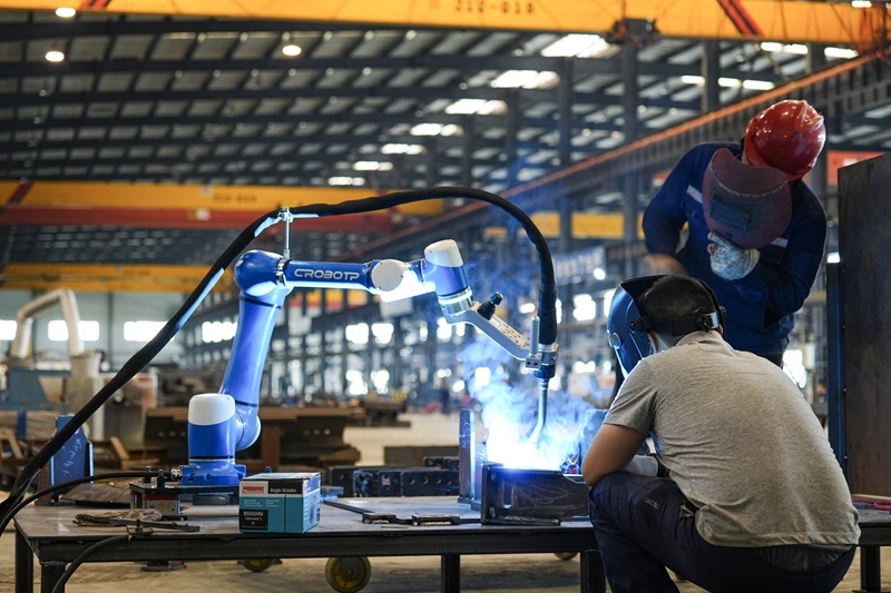 6月26日,在四川天府新區(qū)眉山片區(qū)青龍街道的新筑智能工程裝備制造有限公司車間內(nèi),工人們配合機(jī)器人焊接產(chǎn)品。