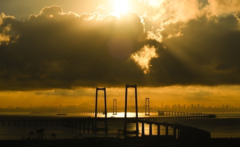珠江口伶仃洋上,深中通道沐浴在晨曦之中,長(zhǎng)虹臥波、美不勝收。