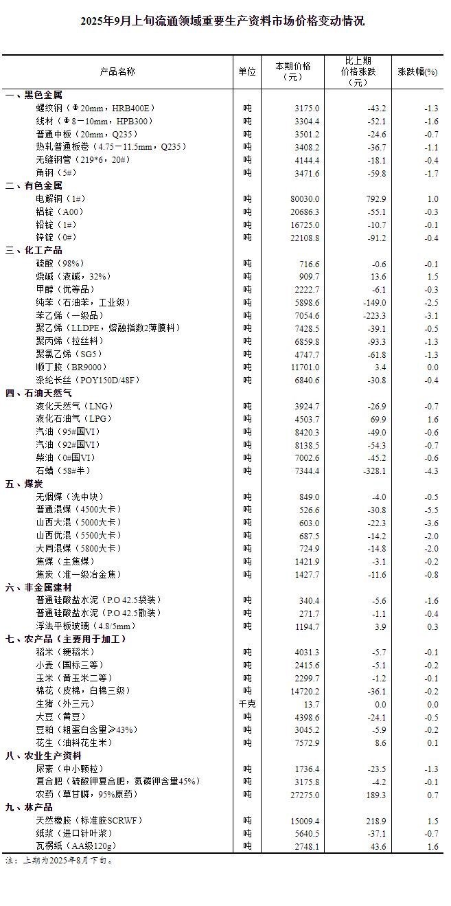 據對全國流通領域9大類50種重要生產資料市場價格的監(jiān)測顯示,2025年9月上旬與8月下旬相比,8種產品價格上漲,40種下降,2種持平。