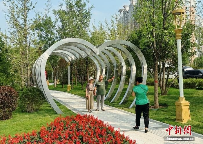 9月12日,民眾在山西省太原市迎澤大街月老廣場心形廊架下合影留念?!≈行律缬浾?李庭耀 攝