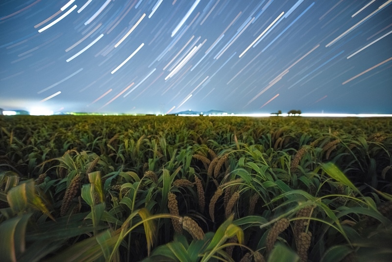 9月17日在黑龍江省佳木斯市富錦市拍攝的星空下的谷子(堆棧合成照片)。