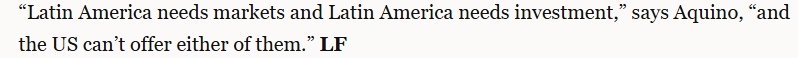 文章指出,并非所有人都對(duì)拉美與中國(guó)之間的合作感到滿(mǎn)意。華盛頓尤其擔(dān)心。不過(guò),許多人認(rèn)為華盛頓影響拉丁美洲的能力有限。文章援引利馬國(guó)立圣馬科斯大學(xué)的亞洲經(jīng)濟(jì)專(zhuān)家卡洛斯·阿基諾的話指出,“拉丁美洲需要市場(chǎng)和投資,但美國(guó)無(wú)法提供其中任何一項(xiàng)”。