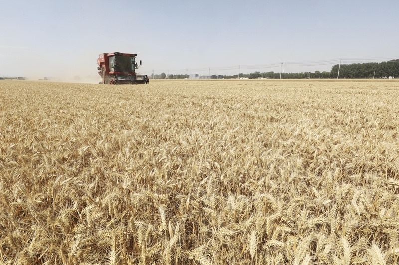 6月5日,河南省焦作市溫縣武德鎮(zhèn)農民駕駛收割機收獲小麥。