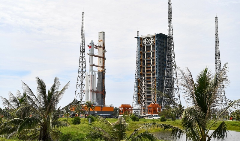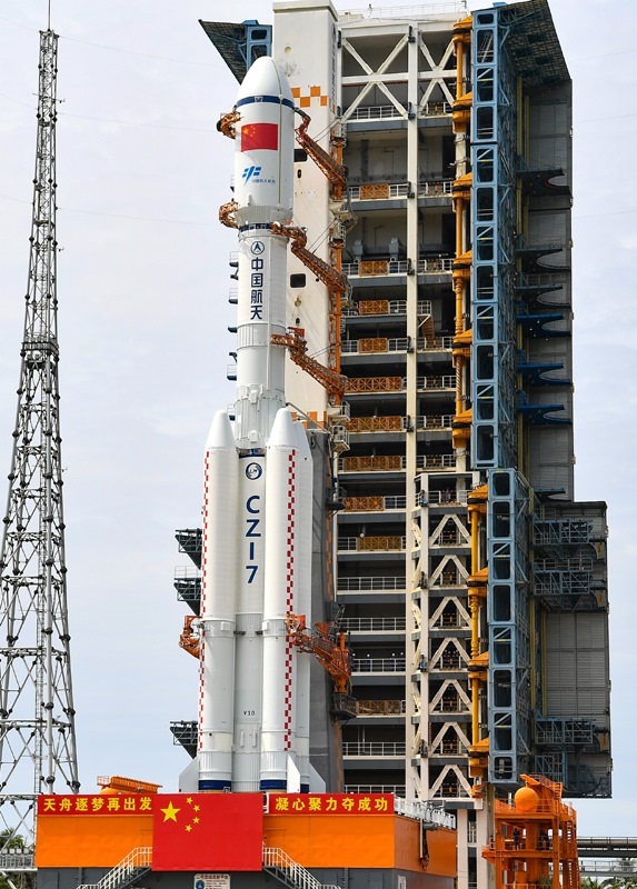 7月12日,天舟九號貨運(yùn)飛船與長征七號遙十運(yùn)載火箭組合體垂直轉(zhuǎn)運(yùn)中。