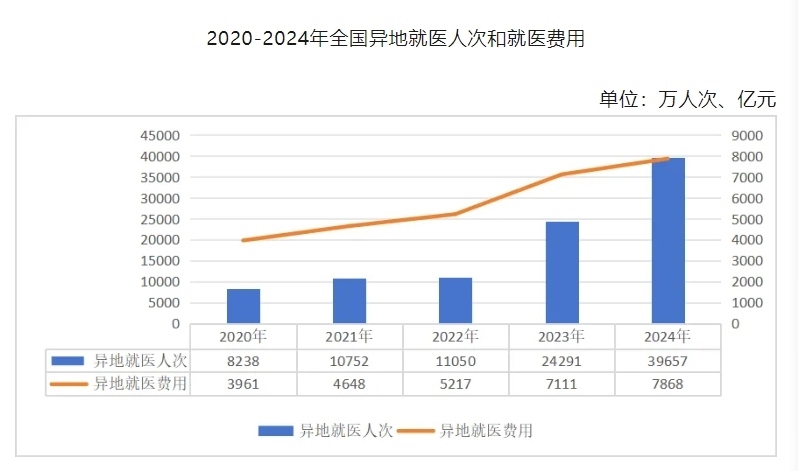 數(shù)據(jù)顯示,2020年至2024年間,全國異地就醫(yī)人次和就醫(yī)費(fèi)用呈增長態(tài)勢。