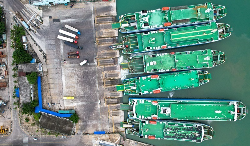 7月22日,在??谑行阌⒏?,車輛有序駛?cè)肟蜐L船(無人機照片)。