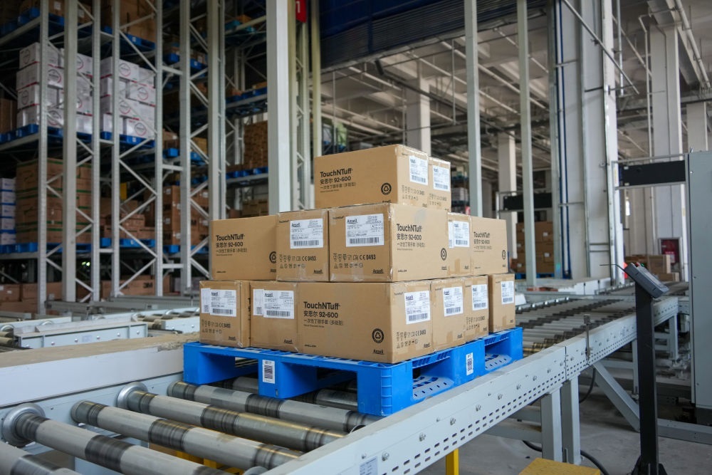 在山東臨沂的新明輝智慧倉儲(chǔ)物流園,貨物在傳輸帶上運(yùn)輸(2025年6月11日攝)。新華社記者 徐速繪 攝