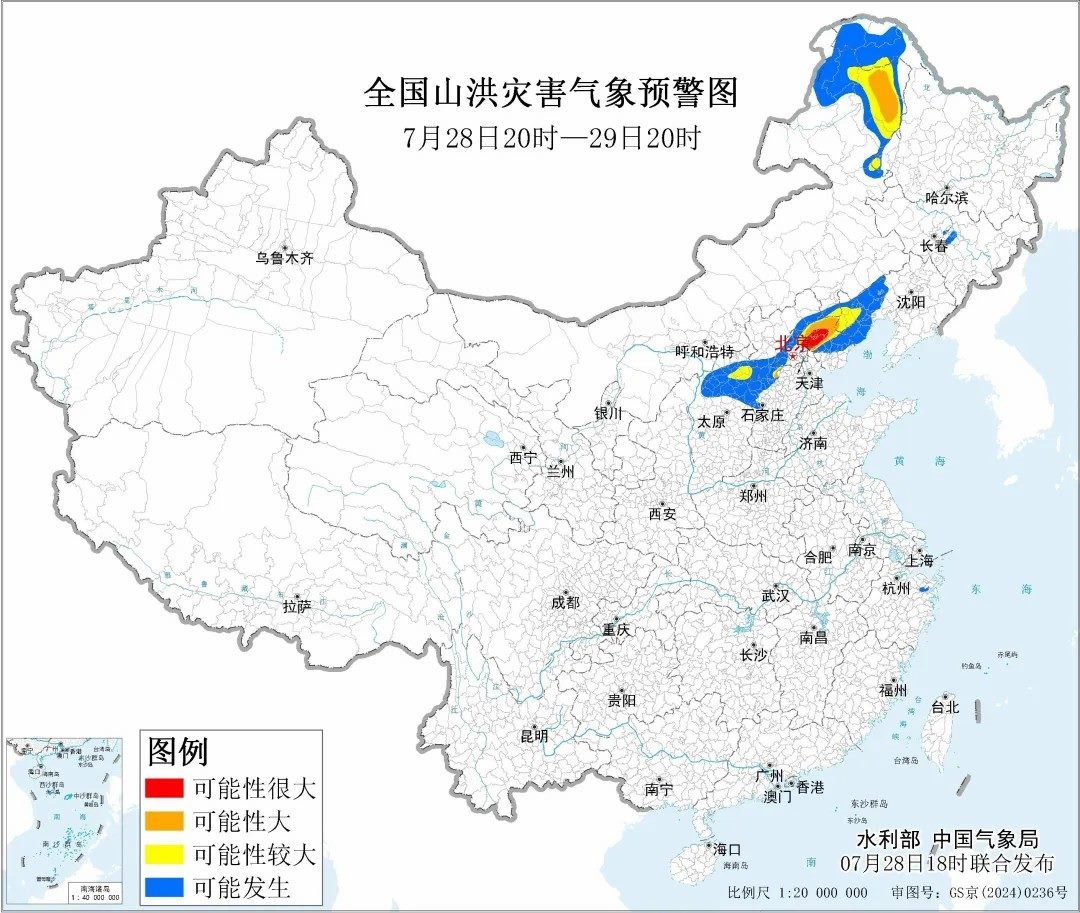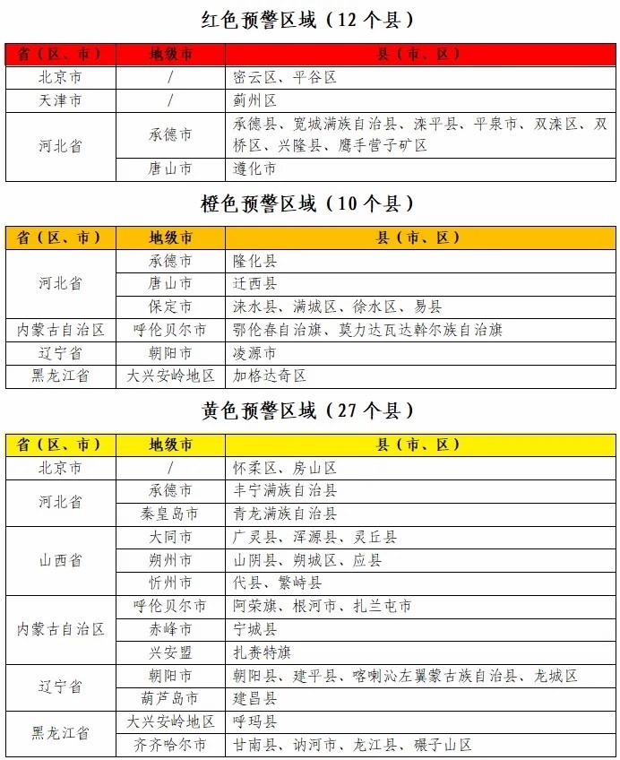 據(jù)“中國水利”微信公眾號消息,水利部和中國氣象局7月28日18時聯(lián)合發(fā)布紅色山洪災(zāi)害氣象預(yù)警:預(yù)計,7月28日20時至7月29日20時,北京東部、天津北部、河北中部和東北部、內(nèi)蒙古東北部、遼寧西部、黑龍江西部等地部分地區(qū)發(fā)生山洪災(zāi)害可能性大(橙色預(yù)警),其中,北京東部、天津北部、河北東北部局地發(fā)生山洪災(zāi)害可能性很大(紅色預(yù)警),預(yù)警區(qū)域涉及的縣(市、區(qū))見下表。其他地區(qū)也可能因局地短歷時強降水引發(fā)山洪災(zāi)害,請各地注意做好實時監(jiān)測、防汛預(yù)警和轉(zhuǎn)移避險等防范工作。