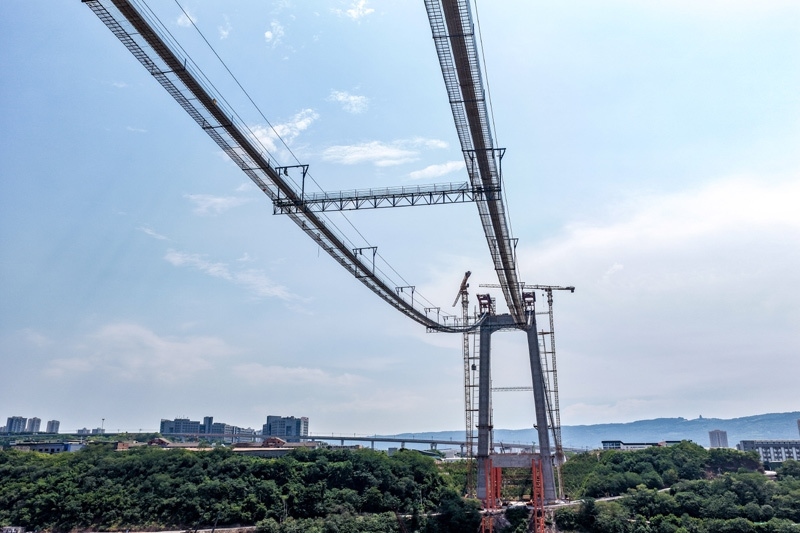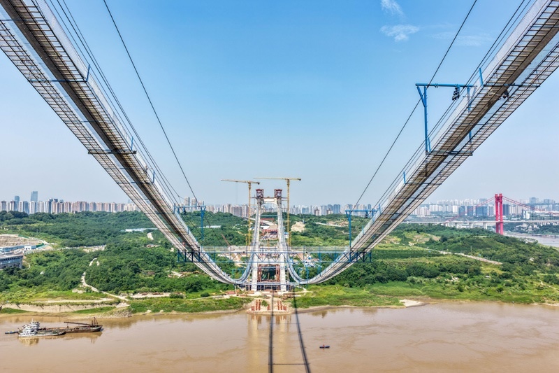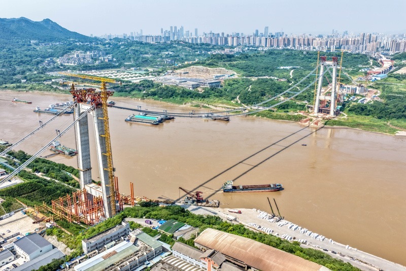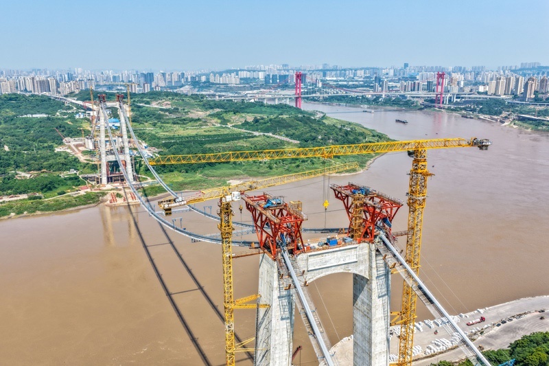 當(dāng)日,由重慶城投集團投資、城投建設(shè)公司組織建設(shè)、中國鐵建大橋局承建的黃桷沱長江大橋順利完成主纜架設(shè)工作,標(biāo)志著大橋建設(shè)即將進入鋼桁梁吊裝工序。黃桷沱長江大橋全長1260米,主跨765米,為單跨懸吊雙塔三跨連續(xù)鋼桁梁懸索橋,是國內(nèi)最大跨徑公軌兩用懸索橋。黃桷沱長江大橋是渝長高速復(fù)線連接道工程的控制性節(jié)點工程,建成后將成為聯(lián)系重慶主城區(qū)長江南北兩岸的重要交通干道。