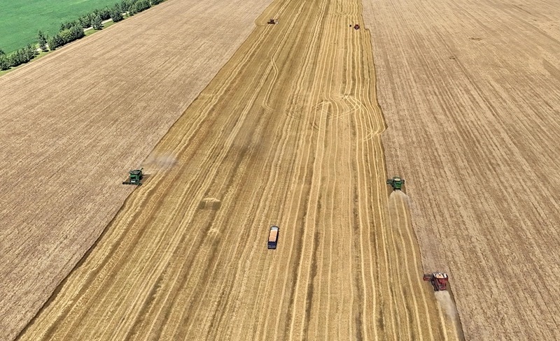 8月5日,位于黑龍江省五大連池市的大慶油田農(nóng)場調(diào)動多臺聯(lián)合收割機搶收小麥(無人機照片)。