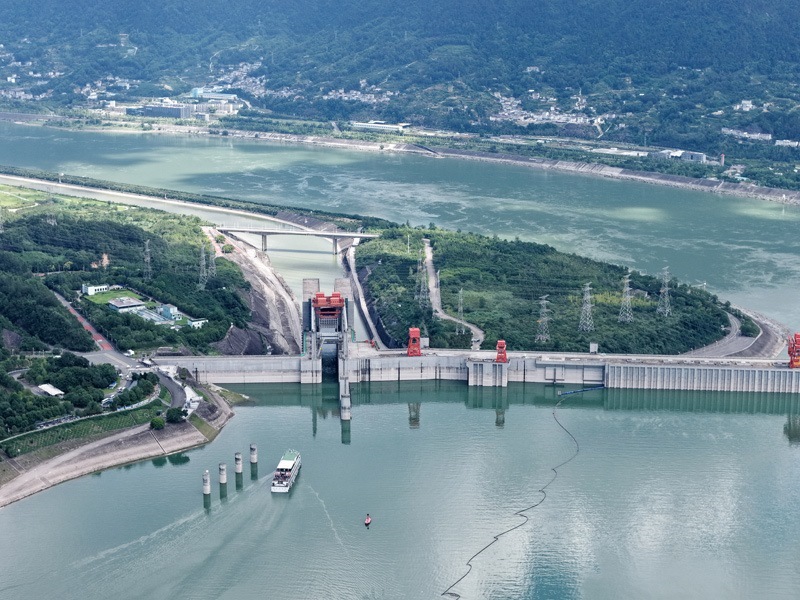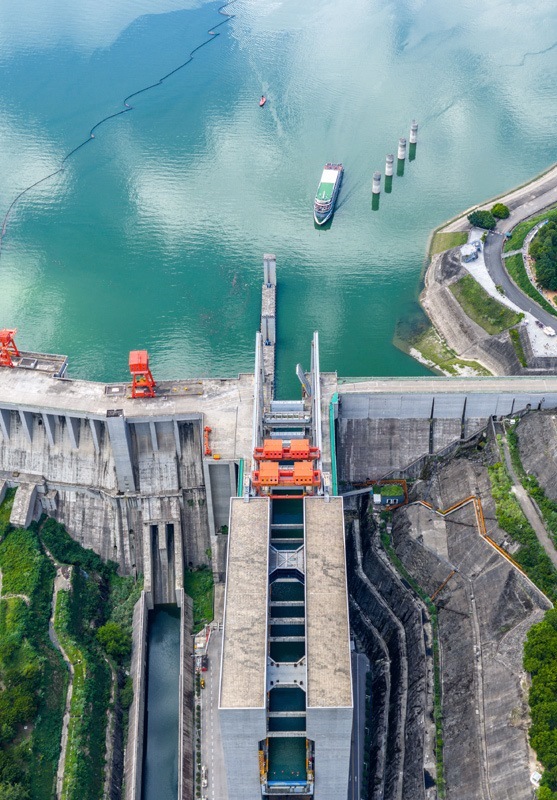 8月16日,在湖北省宜昌市,游輪長江三峽5號(hào)駛向三峽升船機(jī)(無人機(jī)照片)。