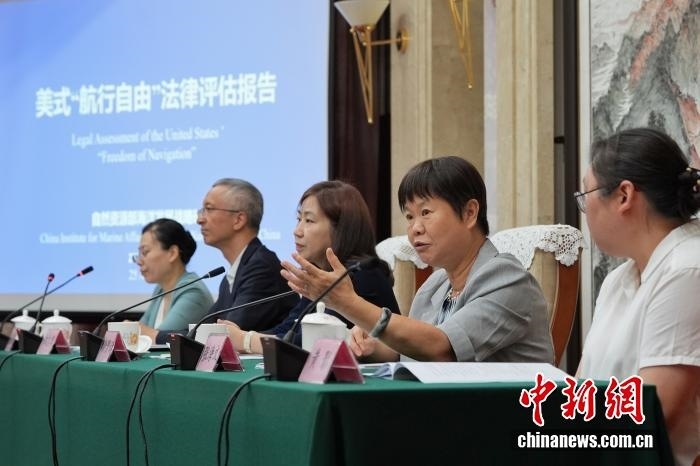 8月25日,中國(guó)自然資源部海洋發(fā)展戰(zhàn)略研究所在北京發(fā)布《美式“航行自由”法律評(píng)估報(bào)告》中英文版。該《報(bào)告》旨在對(duì)美國(guó)“航行自由”相關(guān)主張和實(shí)踐是否符合國(guó)際條約和一般國(guó)際法、是否具備法律基礎(chǔ)進(jìn)行評(píng)估。圖為自然資源部海洋發(fā)展戰(zhàn)略研究所前所長(zhǎng)張海文(右二)答記者問(wèn)。中新社記者 張祥毅 攝