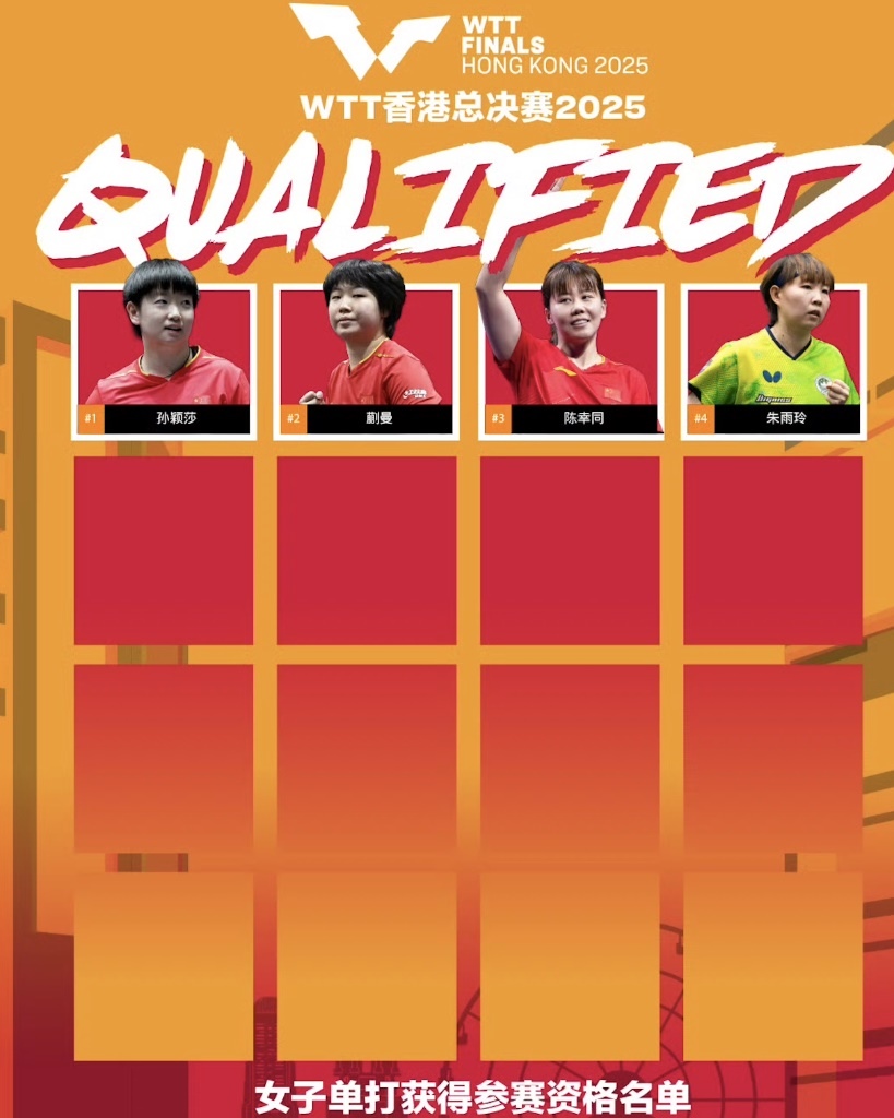 中國隊孫穎莎、蒯曼、陳幸同及中國澳門隊的朱雨玲獲得WTT香港總決賽女子單打參賽資格。圖片來自WTT世界乒聯官方微博