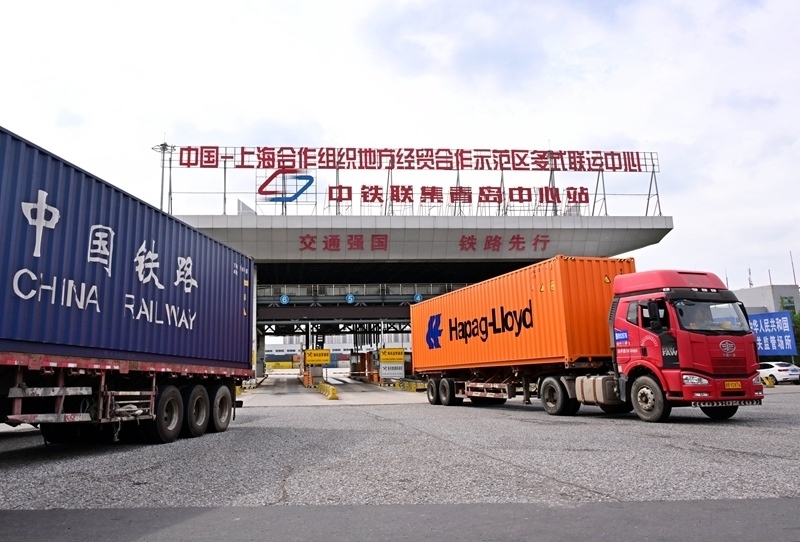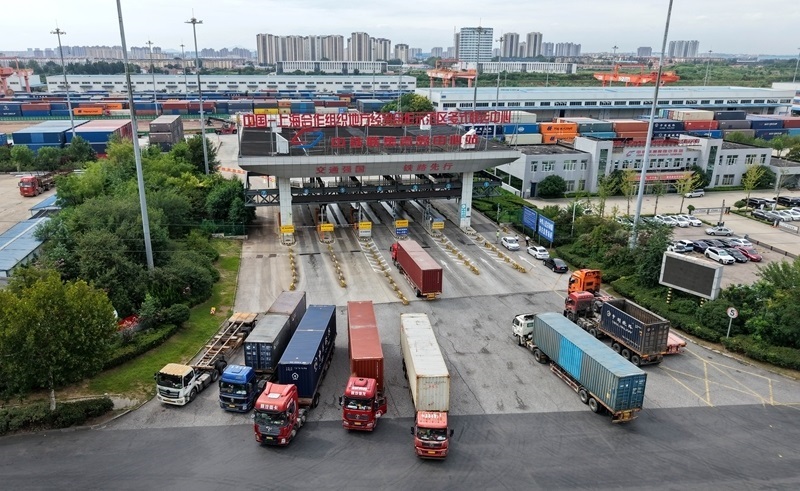 8月27日,貨運卡車從位于上合示范區(qū)的中國-上海合作組織地方經(jīng)貿(mào)合作示范區(qū)多式聯(lián)運中心駛出。