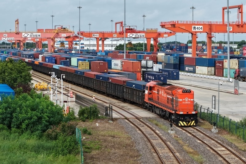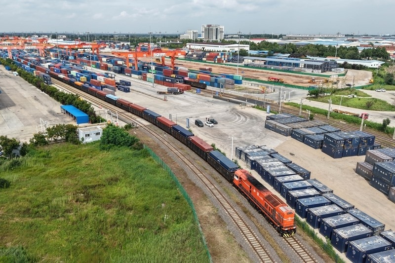 8月27日,一列貨運列車駛?cè)胛挥谏虾鲜痉秴^(qū)內(nèi)的中國-上海合作組織地方經(jīng)貿(mào)合作示范區(qū)多式聯(lián)運中心(無人機照片)。