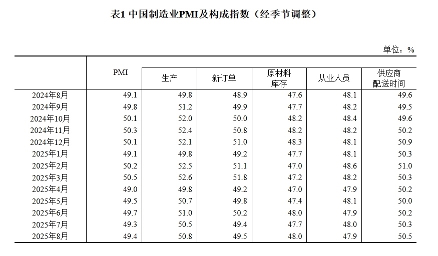 據(jù)國家統(tǒng)計局網(wǎng)站消息,國家統(tǒng)計局8月31日發(fā)布2025年8月中國采購經(jīng)理指數(shù)運行情況。