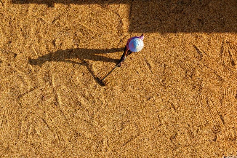 8月31日,在福建省南平市浦城縣仙陽鎮(zhèn),村民駕駛收割機在田間作業(yè)(無人機照片)。