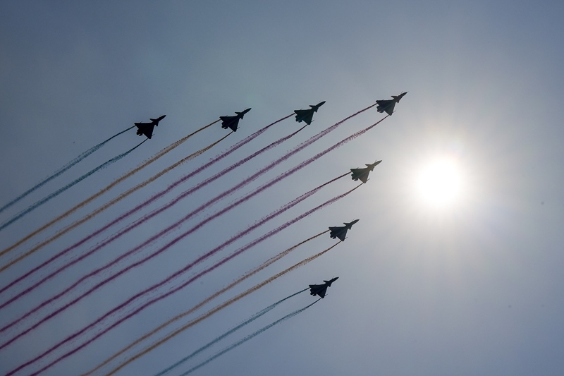 9月3日,紀(jì)念中國(guó)人民抗日戰(zhàn)爭(zhēng)暨世界反法西斯戰(zhàn)爭(zhēng)勝利80周年大會(huì)在北京隆重舉行。這是教練機(jī)梯隊(duì)通過(guò)天安門(mén)廣場(chǎng)。