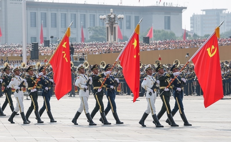 9月3日,紀(jì)念中國人民抗日戰(zhàn)爭暨世界反法西斯戰(zhàn)爭勝利80周年大會(huì)在北京隆重舉行。這是戰(zhàn)旗方隊(duì)接受檢閱。