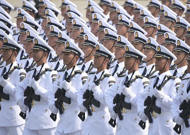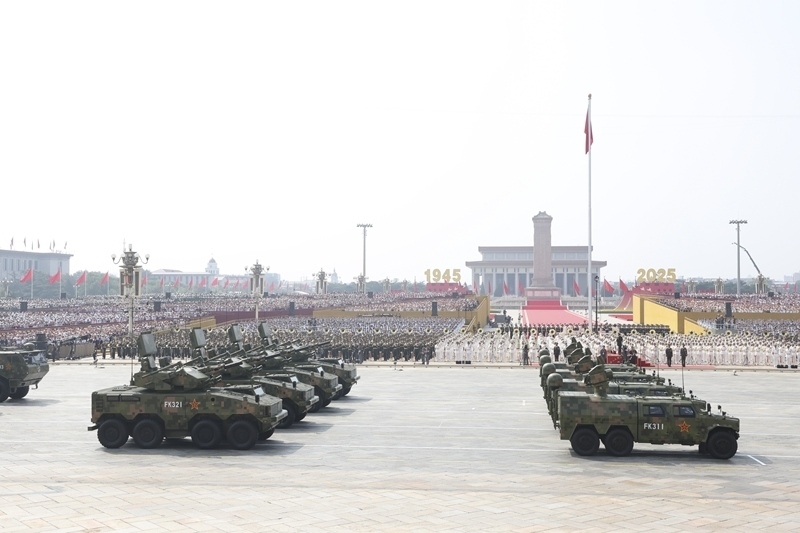 9月3日,紀(jì)念中國人民抗日戰(zhàn)爭暨世界反法西斯戰(zhàn)爭勝利80周年大會(huì)在北京隆重舉行。這是艦載防空武器方隊(duì)接受檢閱。