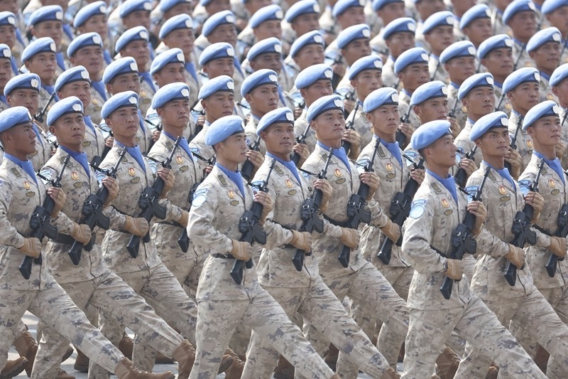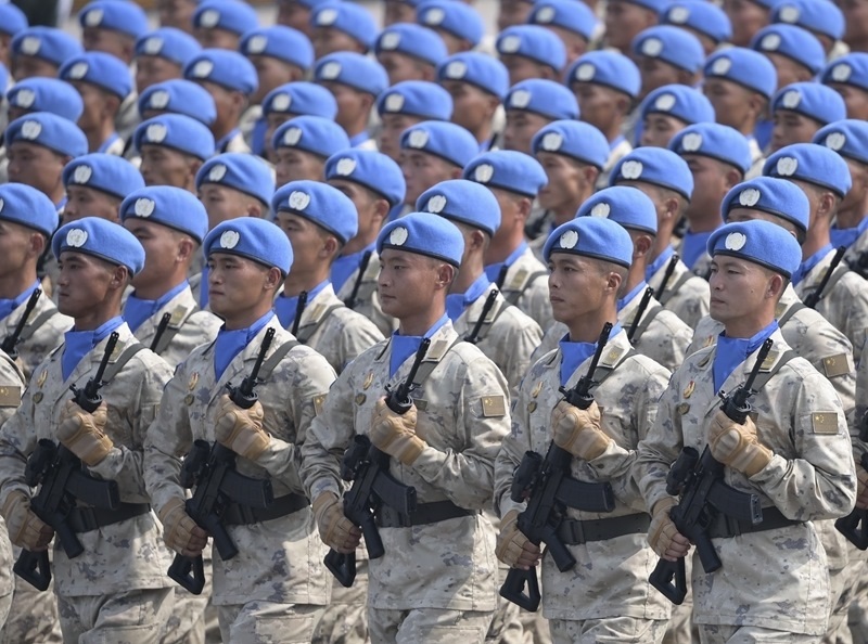9月3日,紀(jì)念中國人民抗日戰(zhàn)爭暨世界反法西斯戰(zhàn)爭勝利80周年大會(huì)在北京隆重舉行。這是維和部隊(duì)方隊(duì)接受檢閱。