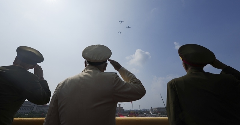 9月3日,紀(jì)念中國人民抗日戰(zhàn)爭暨世界反法西斯戰(zhàn)爭勝利80周年大會(huì)在北京隆重舉行。這是轟炸機(jī)梯隊(duì)飛過天安門廣場(chǎng)上空時(shí)嘉賓敬禮。
