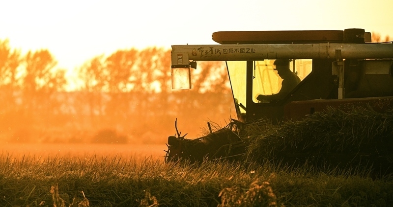 10月3日,農(nóng)戶在北大荒集團黑龍江八五六農(nóng)場有限公司第五管理區(qū)搶收水稻(無人機照片)。