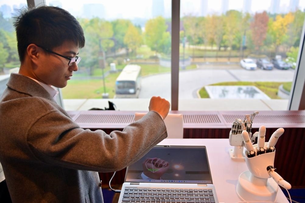 10月17日,在中國科學(xué)院沈陽自動化研究所展臺,工作人員演示“仿生五指靈巧手”展品。新華社記者 吳青昊 攝