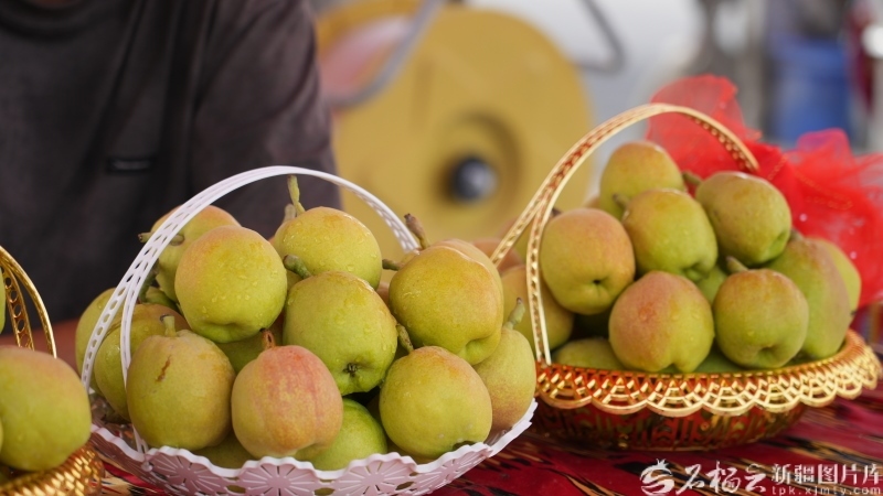 庫(kù)爾勒市庫(kù)爾楚園藝場(chǎng)梨園里,剛采摘下來(lái)的香梨黃中泛紅,非常誘人(資料圖)。庫(kù)爾勒市融媒體中心供圖