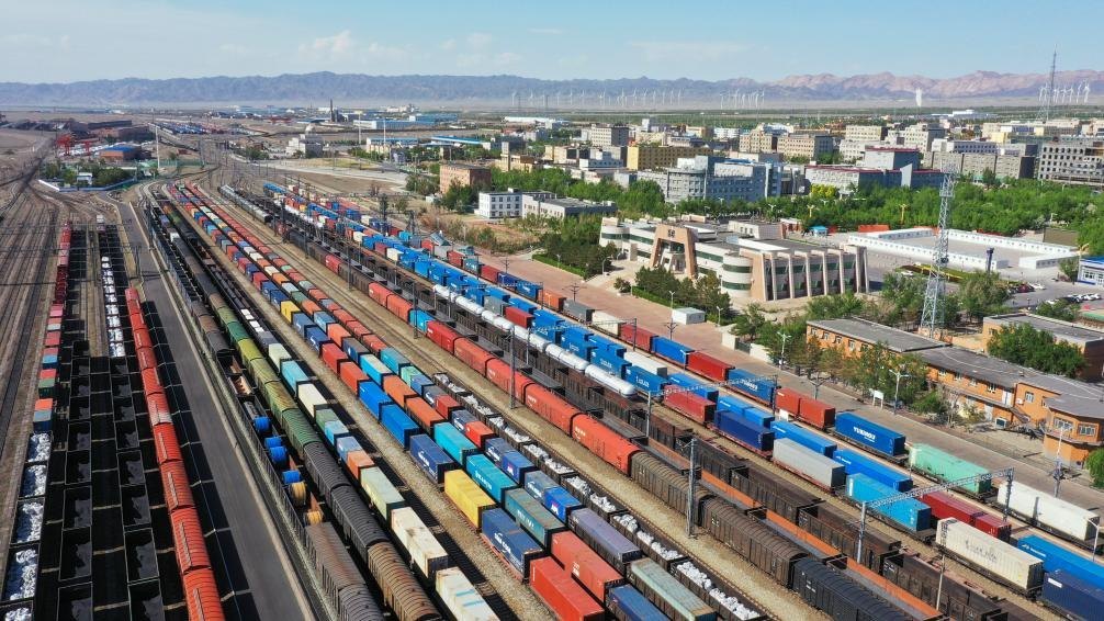 在新疆阿拉山口站寬準(zhǔn)軌編組場(chǎng),出入境中歐班列集結(jié)等待出發(fā)(2024年5月25日攝,無人機(jī)照片)。新華社發(fā)(于暉 攝)