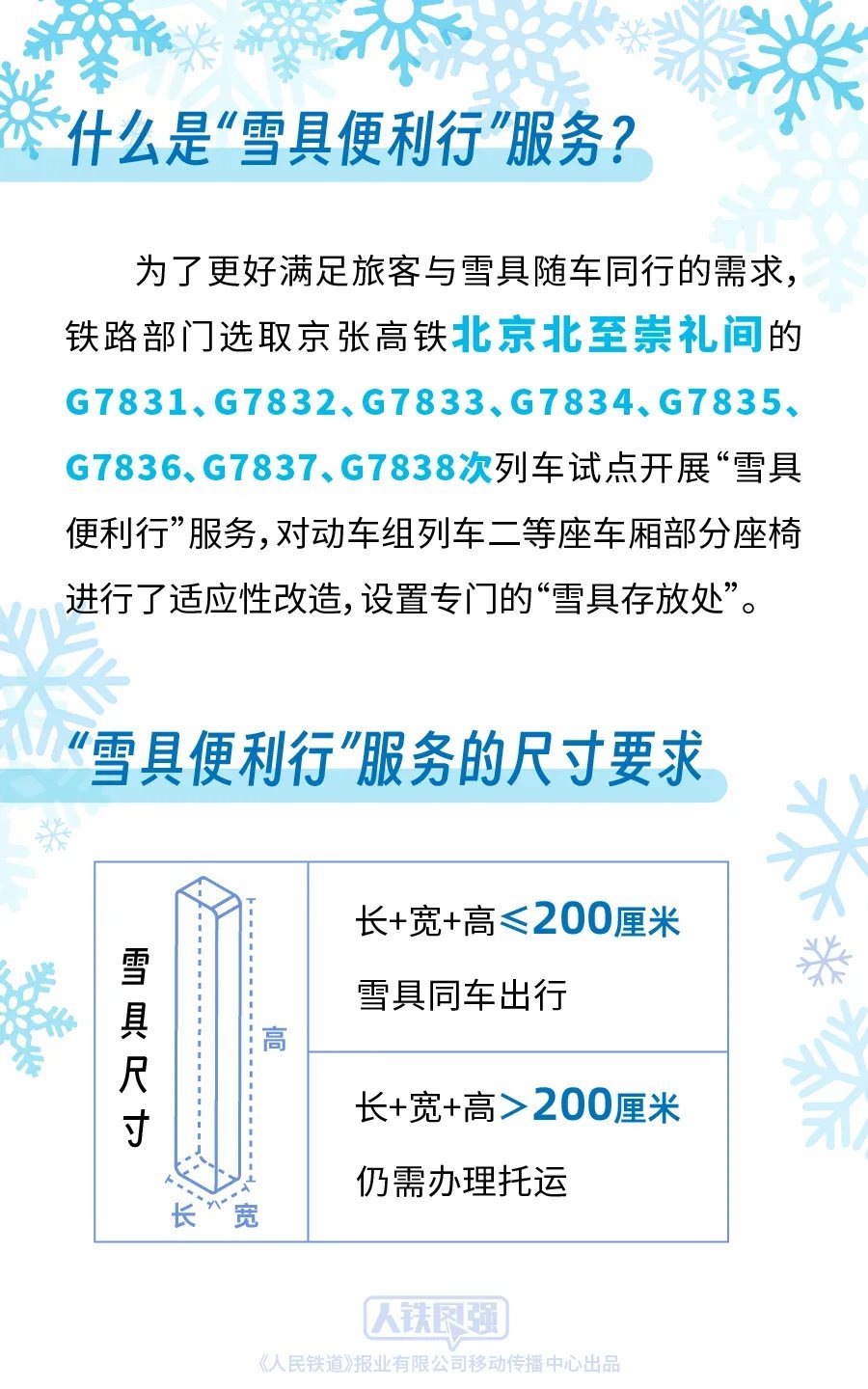 鐵路部門堅持以人民為中心的發(fā)展思想,持續(xù)深化運輸供給側結構性改革,積極適應旅客多樣化的出行需求,為攜帶雪具出行的旅客提供便捷服務。前期,鐵路部門按照《國鐵集團鐵路旅客運輸規(guī)程》“旅客乘坐動車組列車隨身攜帶的行李物品長、寬、高之和不超過130厘米”的規(guī)定,對超過上述尺寸標準的雪具推出了“雪具快運”服務。為了更好滿足旅客與雪具隨車同行的需求,鐵路部門統(tǒng)籌考慮旅客安全、乘車秩序和雪具運輸需求,選取京張高鐵北京北至崇禮間的G7831、G7832、G7833、G7834、G7835、G7836、G7837、G7838次列車試點開展“雪具便利行”服務,對動車組列車二等座車廂部分座椅進行了適應性改造,設置專門的“雪具存放處”,旅客選擇該服務后可攜帶長、寬、高之和不超過200厘米的雪具同車出行,滑雪更加方便快捷。對于長、寬、高之和超過200厘米的雪具,由于高鐵列車車內空間限制,仍需辦理托運。