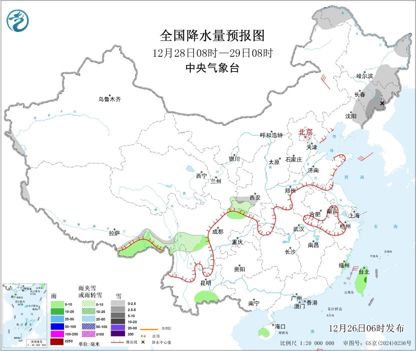 12月28日08時至29日08時,內(nèi)蒙古東北部、東北地區(qū)北部和東部、西藏東南部、陜西南部、四川中部等地部分地區(qū)有小雪或雨夾雪,其中,吉林東部等地部分地區(qū)有中到大雪(5~7毫米)。西藏東南部、四川中部、云南南部、海南島中部、臺灣島等地部分地區(qū)有小雨,其中,臺灣島東部等地部分地區(qū)有中雨。內(nèi)蒙古東部部分地區(qū)有4~6級風(fēng);南部海域有5~6級風(fēng),陣風(fēng)7~8級。