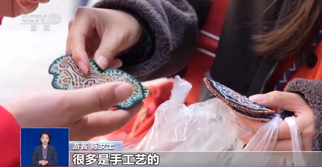 游客 陳女士:就買了一個(gè)包、一幅畫,然后還有兩個(gè)貼片。很多是手工藝的。