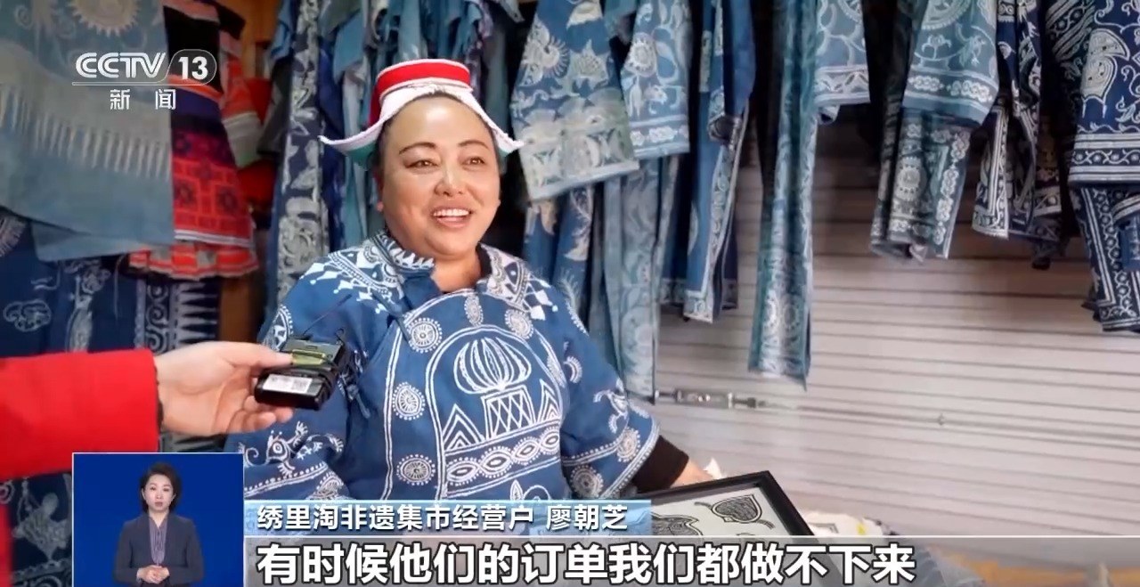 繡里淘非遺集市經(jīng)營(yíng)戶 廖朝芝:我們家主要是賣蠟染。顧客很喜歡,有時(shí)候給我們介紹訂單,有時(shí)候他們的訂單我們都做不下來。