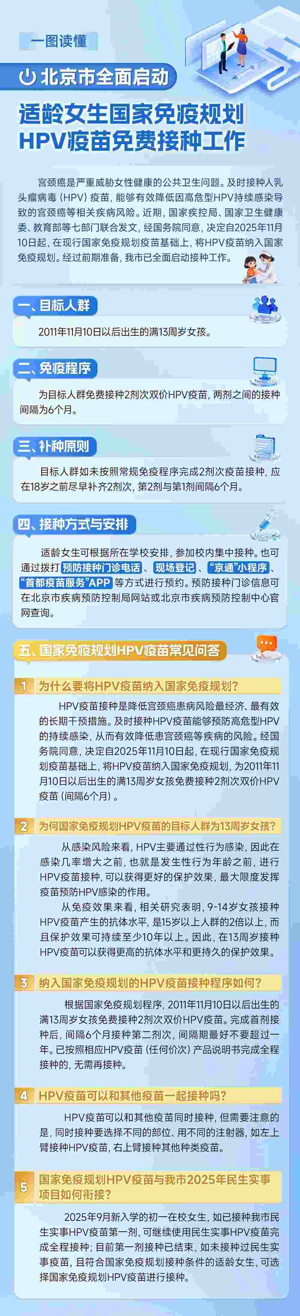 適齡女生可根據(jù)所在學(xué)校安排,參加校內(nèi)集中接種,也可通過(guò)撥打預(yù)防接種門(mén)診電話、現(xiàn)場(chǎng)登記、“京通”小程序、“首都疫苗服務(wù)”App等方式預(yù)約。預(yù)防接種門(mén)診信息可在北京市疾病預(yù)防控制局網(wǎng)站或北京市疾病預(yù)防控制中心官網(wǎng)查詢(xún)。