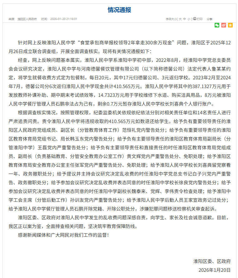 中新網(wǎng)1月21日電 據(jù)周口市淮陽區(qū)人民政府官網(wǎng)消息,近日,淮陽區(qū)委、區(qū)政府發(fā)布通告表示,針對網(wǎng)上反映淮陽人民中學(xué)“食堂承包商舉報校領(lǐng)導(dǎo)2年拿走300余萬現(xiàn)金”問題,淮陽區(qū)于2025年12月26日成立聯(lián)合調(diào)查組,開展全面調(diào)查核實(shí)?,F(xiàn)將有關(guān)情況通報如下: