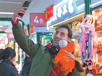 1月12日,在浙江義烏市國際商貿城一區(qū)玩具銷售區(qū),芬蘭外商與“哭哭馬”小馬公仔玩具合影。