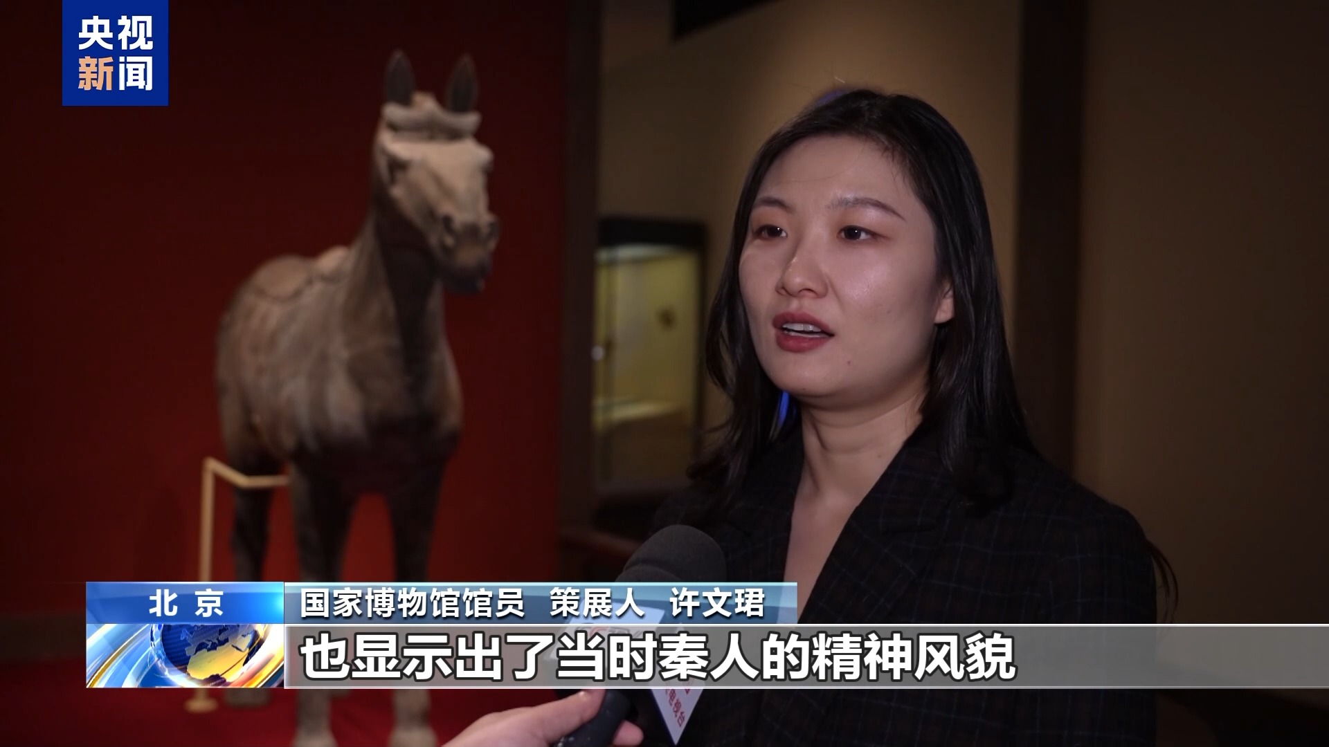 國家博物館館員、策展人 許文珺:這一件秦始皇帝陵兵馬俑的秦鞍馬,雙蹄直立,它的耳朵是直立的,尾巴也是梳成一個(gè)辮狀,整體非常有力量,也是秦代人對戰(zhàn)馬篩選標(biāo)準(zhǔn)非常嚴(yán)格的體現(xiàn),也顯示出了當(dāng)時(shí)秦人的一個(gè)精神風(fēng)貌。