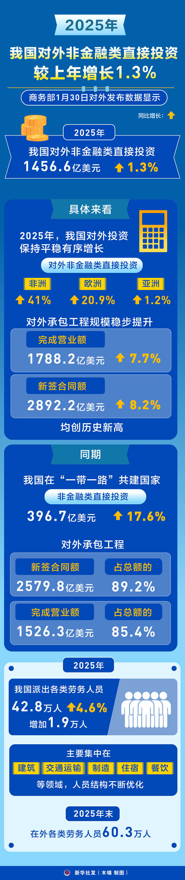 新華社北京1月30日電(記者 謝?,帲┥虅詹?0日對外發(fā)布數據顯示,2025年,我國對外非金融類直接投資1456.6億美元,較上年增長1.3%。