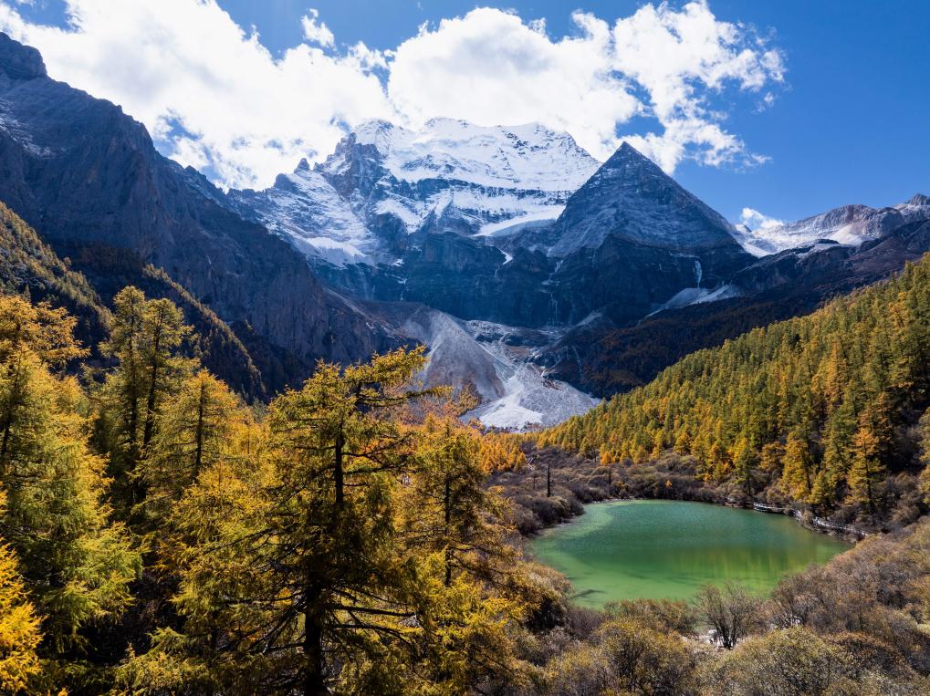 稻城亞丁仙乃日雪山下的湖泊卓瑪拉措掩映在彩林中(2025年10月26日攝,無(wú)人機(jī)照片)。新華社記者江宏景 攝